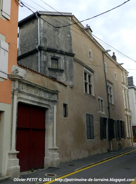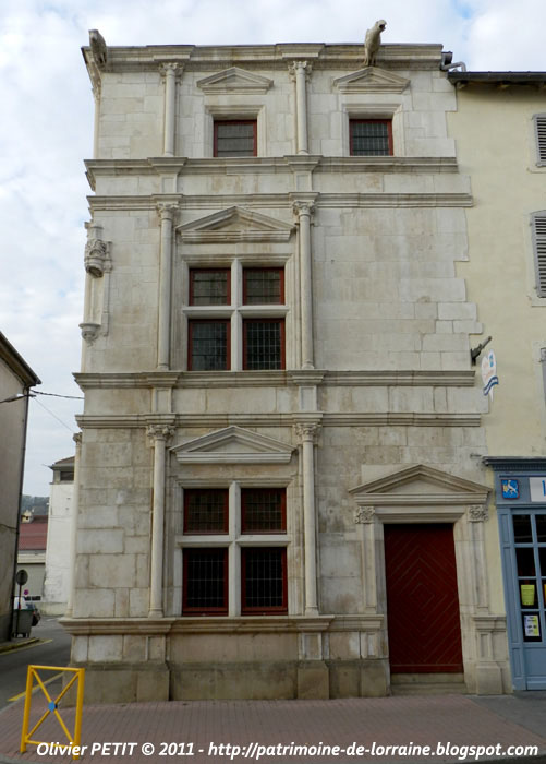 La niche d’angle de cette belle demeure de style Renaissance porte à sa base la date de 1537. En fait, il s’agit sans doute de la reconstruction car cette maison est déjà désignée dans les anciens écrits… «Ainsi un acte du 18 Mai 1346 la mentionne pour la première fois en ces termes: – Henri, comte de Vaudémont, reconnaît que Raoul Duc de Lorraine et ses hoirs ont leurs affouages pour leur maison de Charmes dite du Chaldron». Dans un autre acte daté du 23 décembre 1444, Nicolas de Charmes écrit avoir repris de René Duc de Lorraine une maison avec les usoirs dit la mâson Chaldron.