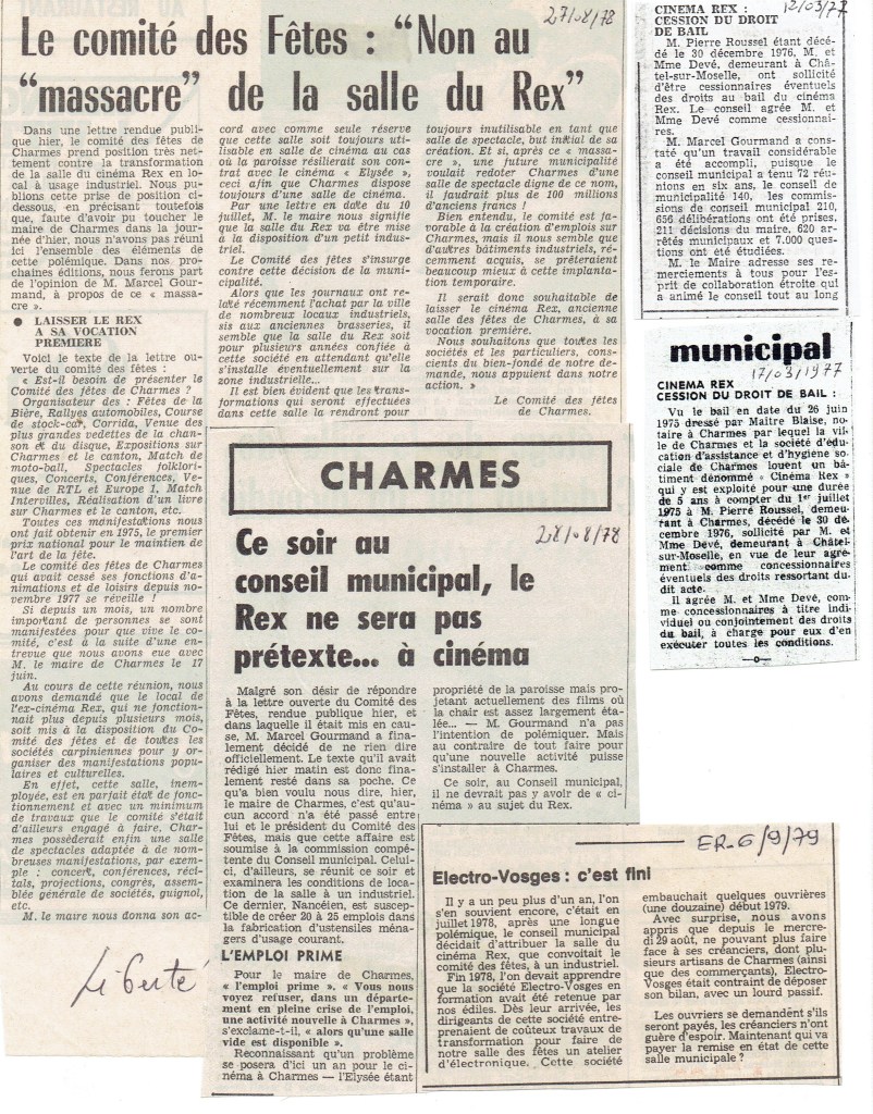 En 1944, après la destruction de Charmes, la salle des fêtes (son nom à l’époque) abrita temporairement dans les salles à l’arrière de l’immeuble : la mairie et la bibliothèque fut utilisée momentanément pour la classe du certificat de fin d’étude dont l’instituteur était Mr Cholez.