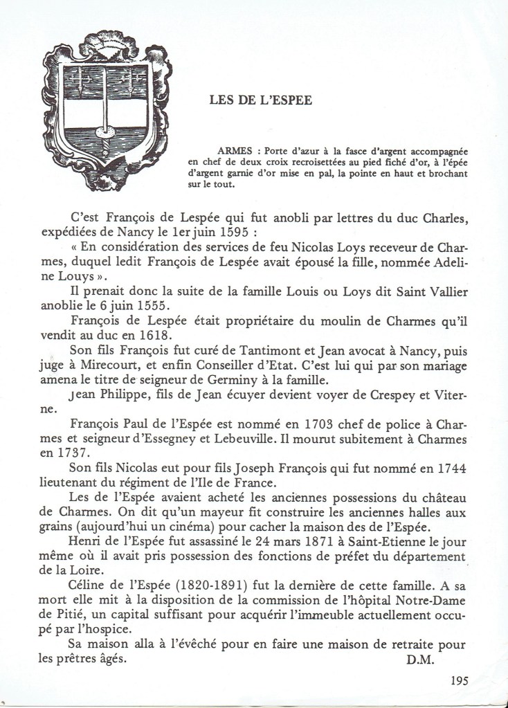 Une biographie de la famille de L’Espée extraite du livre Arts et Gloires de Charmes et son canton.