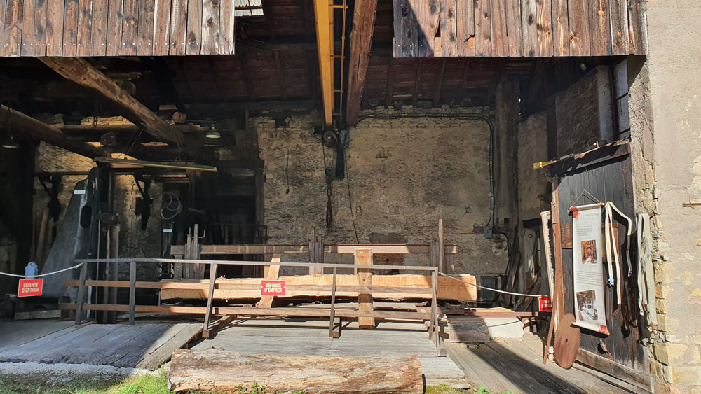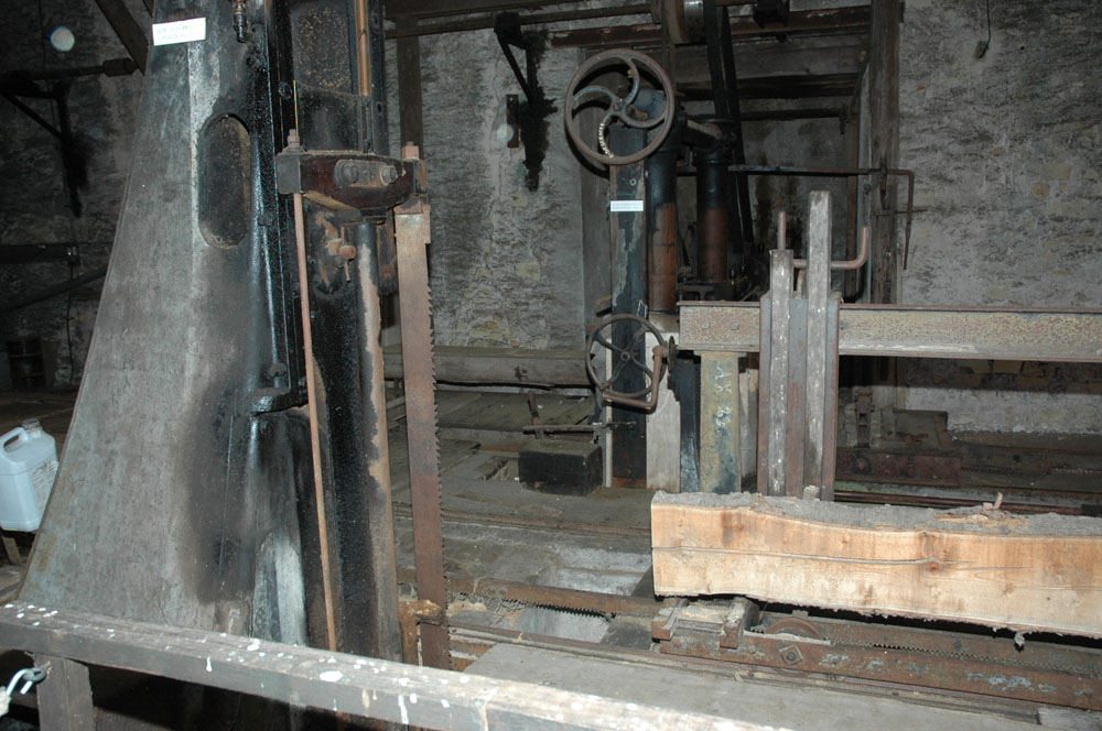 Deuxième atelier : une scierie de 1876 à 1997. A l’origine, elle fonctionnait avec un haut fer. Ce dernier fut remplacé par une scie alternative verticale et une autre horizontale. Elles fonctionnent encore ponctuellement pour des visites de groupes. Les scies alternatives font des coupes à la limite de la perfection.