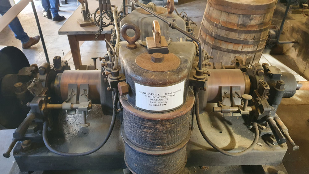 Troisième atelier : Une centrale électrique à la force de l’eau (génératrice). Elle sera active de 1894 à 1914 pour l’éclairage de Charmes qui sera ainsi le deuxième village de France à être alimenté en 110 volts continu fourni par un particulier et d’origine hydraulique. Le premier est un village de Savoie. La centrale du Battant a fonctionné jusqu’en 1986.